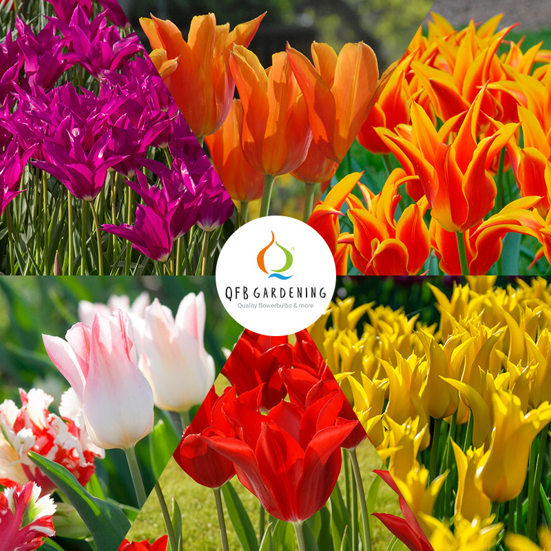 Met onze leliebloemige tulpenbollen collectie haal je een elegante tulpencombinatie in huis! Deze tulpenbollen mix ziet er geweldig uit, vooral in grote groepen! De leliebloemige tulpen in verschillende kleuren van paars tot geel, roze tot rood hebben elegante, enkele, komvormige bloemen die bloeien in het late voorjaar, tussen april en mei. Leliebloemige tulpen hebben een bijzonder dunne stijl, waardoor ze er nog eleganter uitzien. Voor deze tulpen pakket hebben we hoogtegroepen tussen 30 cm en 70 cm gecombineerd, zodat de bloembollen mix een losse tuinlook van verschillende kleuren en hoogtes creëert. Plant deze fantastische mix in je tuin voor een vrolijke kleurencombinatie en geniet van de lange bloei.