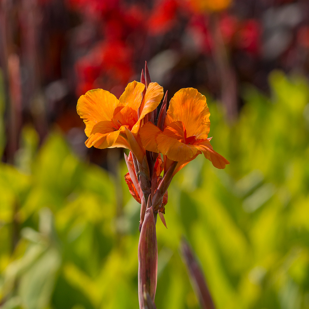 Het felgroene blad met goudgele strepen maakt Canna 'Pretoria' tot een levendig middelpunt in elke tuin, terwijl de vurige bloemen daar als vlammende accenten bovenuit steken. Deze Canna is een echte blikvanger, perfect om een exotisch tintje toe te voegen aan je border of pot. Ze combineert bovendien prachtig met donkerbladige soorten zoals Canna 'Black Knight', voor een krachtig en kleurrijk contrast.