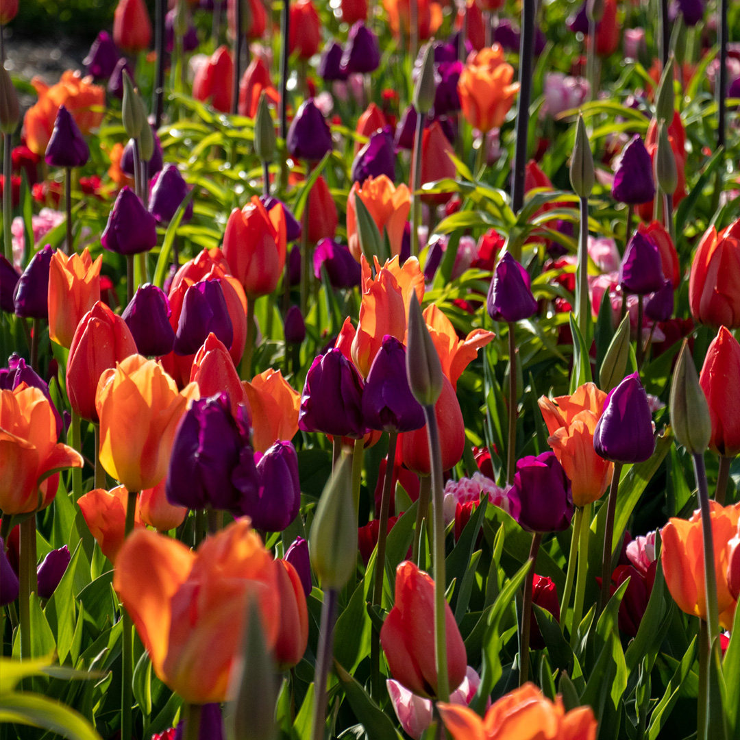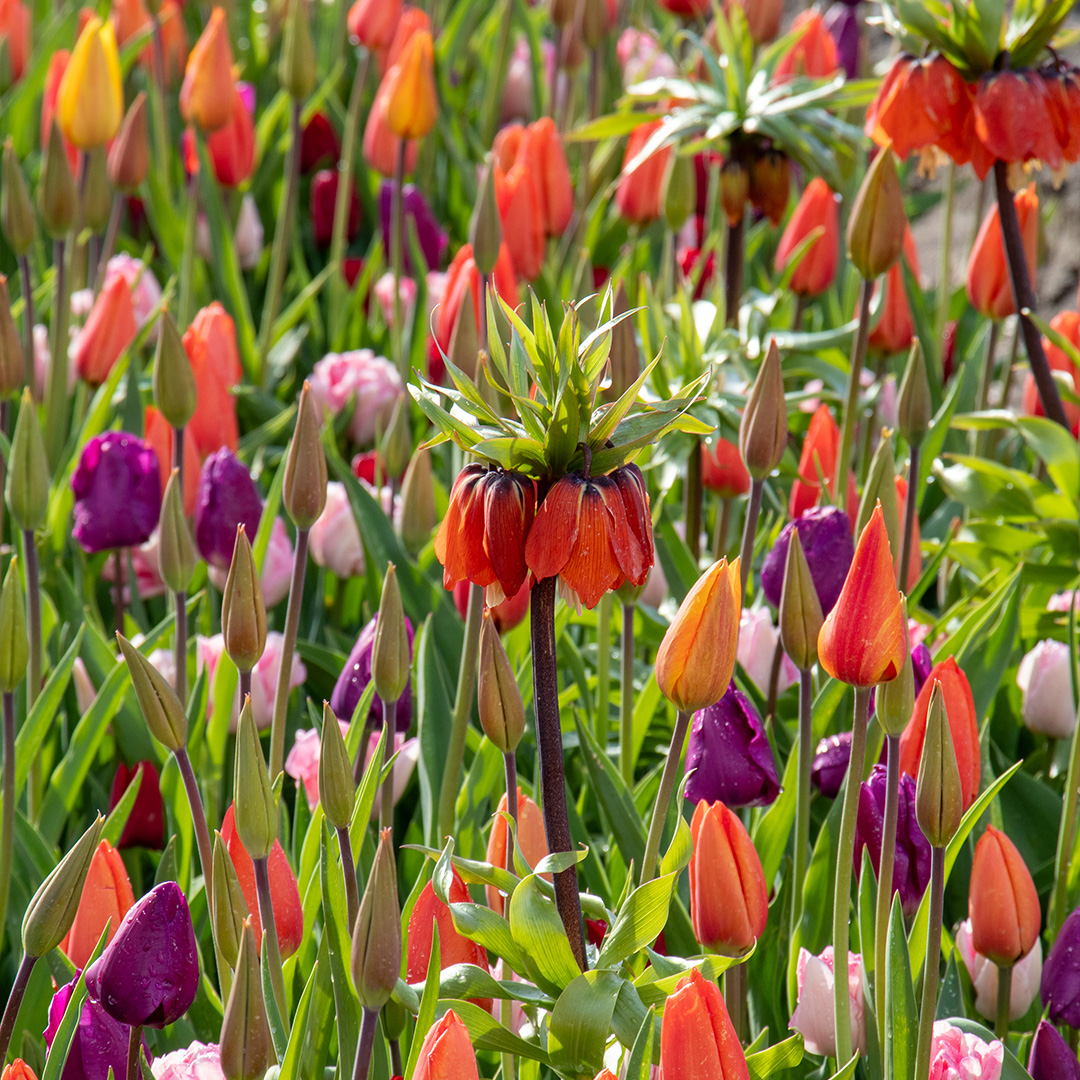 Deze prachtige mix van Tulpen en Fritillaria's combineert warme tinten van vurig oranje, zonnig geel, dieprood en zachte roze- en paarstinten. Het resultaat is een levendig kleurenpalet dat van het vroege voorjaar tot diep in het bloeiseizoen voor een spectaculair bloemenveld zorgt. De mix is zorgvuldig samengesteld om een natuurlijke, speelse uitstraling te creëren. Dankzij de verschillende kleuren en subtiele variaties in bloemvorm ontstaat een dynamisch effect dat perfect past in borders, perken en grote groepen in de tuin. Ook in potten op het terras of balkon komen deze tulpen schitterend tot hun recht.