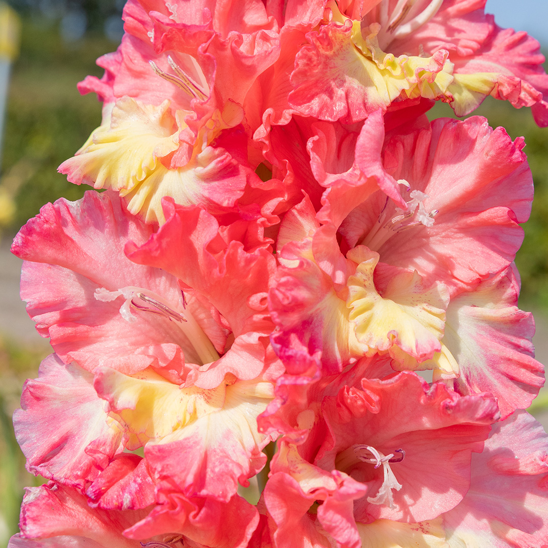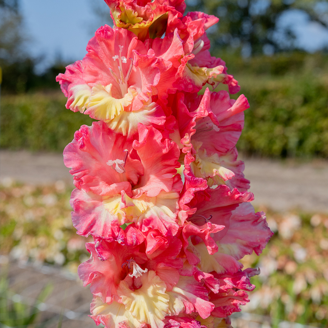 De 'Mango Muse' staat bekend om haar krachtige groei en rijke bloei. De bloemen openen zich geleidelijk langs de stevige stelen, waardoor je wekenlang kunt genieten van een kleurrijk schouwspel. Of ze nu achterin een border staan voor extra hoogte of als blikvanger tussen andere zomerbloeiers: deze gladiool steelt overal de show.