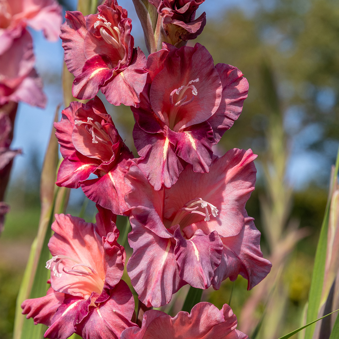 Voeg een vleugje dramatiek en warmte toe aan je zomerborder met de adembenemende Gladiolus 'Rusty Chestnut'. Deze variëteit is een absolute favoriet onder liefhebbers van bijzondere kleuren; haar diepe, roestbruine en kastanje-achtige tinten zijn een zeldzame verschijning in de bloemenwereld.