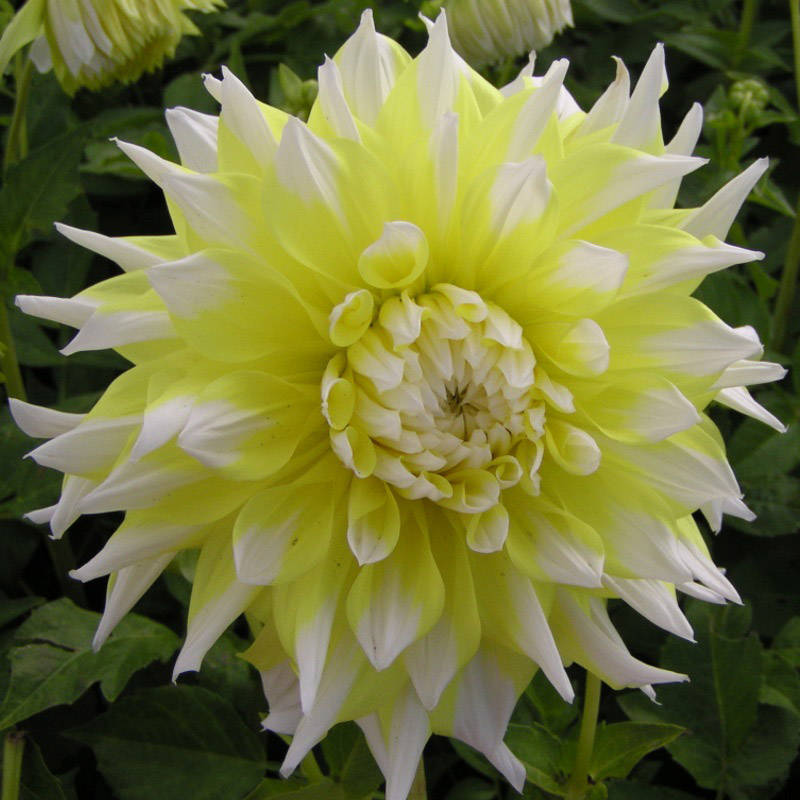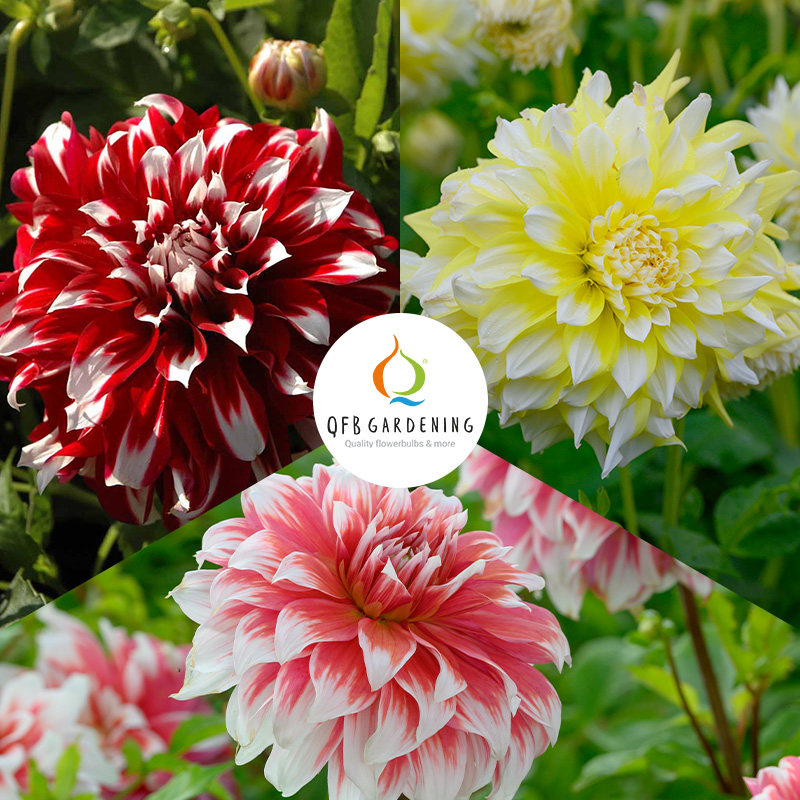 Deze grootbloemige dahlia pakket bestaat uit 3 dinnerplate dahliaknollen, ook wel reuze dahlia’s of superdahlia’s genoemd. Hun bloemen hebben een diameter van meer dan 20 cm, zo groot als een diner bord. Deze reuze dahliamix bestaat uit drie verschillende Dinnerplate dahlia's. De prachtige dahlia Grand Prix presenteert zich met citroengeel blad en een bloemdiameter van 22cm. Een prachtige witte rand maakt dat elk bloemblaadje er perfect uitziet. Een ongeëvenaarde beauty die indruk maakt op iedereen, een geweldige uitstraling heeft deze bloem met haar weelderige vormen. De Dahlia X Factor® is prachtig met zijn rode en witte bloemblaadjes en maakt echt indruk op iedereen. Deze decoratieve dahlia heeft een krachtige uitstraling die natuurlijk in geen enkele tuin mag ontbreken. De bloemdiameter van deze superdahlia is 20cm. De Frost Nip dahlia completeert de grootbloemige Dahlia Mix met zijn oranje bloemblaadjes met witte randen. Deze reuze dahlia heeft ook een diameter van 22cm.