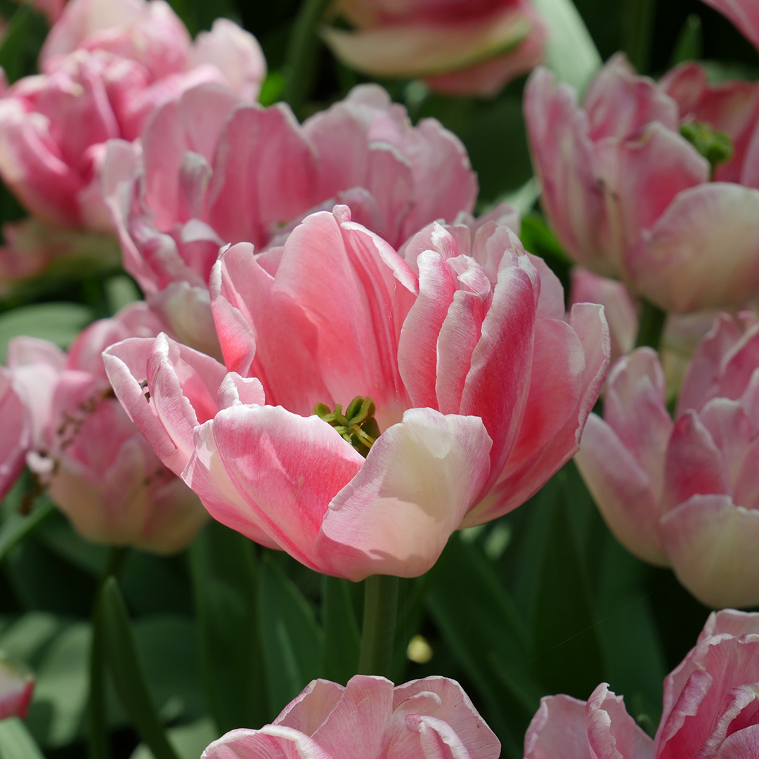 De kleur van de bloem van de Foxtrot tulpenbol is eerst wit en kleurt langzaamaan roze. Deze dubbele, volle bloem, heeft een zachtgeel hartje. De bloem staat op een stevige, donkere steel, van ongeveer 30 cm. De donkere steel steekt mooi af bij de lichtgekleurde bloem. Omdat de steel van de Foxtrot tulpenbol niet zo hoog wordt zijn deze tulpenbollen zeer geschikt om een pot mee te beplanten.