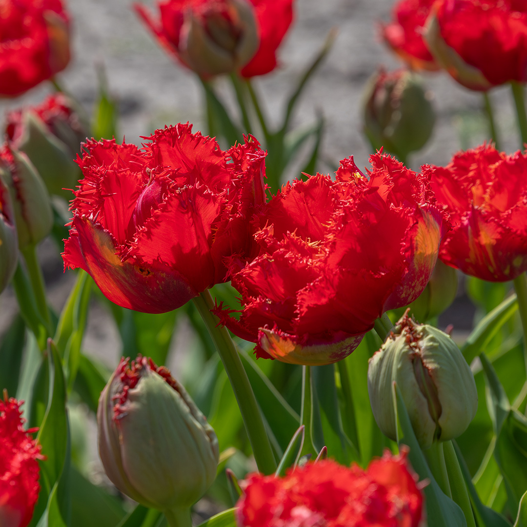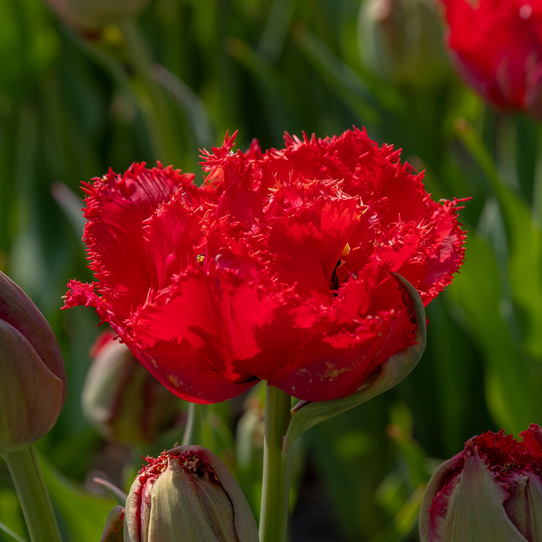 Iedereen die van rode bloemen houdt, moet verliefd worden op de Mi Amor-tulp (Tulipa). Deze verbazingwekkende variëteit produceert dubbele, rode, extra grote bloemen met diep gefranjerde bloembladen. Het past goed bij tulpensoorten en andere bolvormige vaste planten waarvan de bloemen verschillende kleuren aannemen. De zeer decoratieve Mi Amor tulp bloeit begin april en mei, dus in het tulphoogseizoen. Het kan op vele manieren worden gebruikt om groene gebieden rond uw huis te versieren.