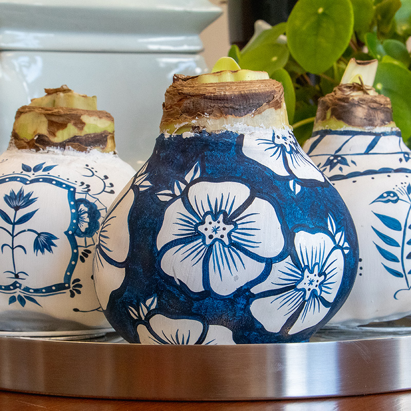 Deze wax amaryllis collectie "Delfts Blauw" bestaat uit drie bijzondere en unieke wax amaryllissen in het beroemde Delfts Blauwe ontwerp. Dit pakket bevat drie verschillende XXL wax amaryllissen met een omtrek van 36/38. Ze zijn stuk voor stuk met de hand beschilderd en genummerd. Een echt uniek stuk.