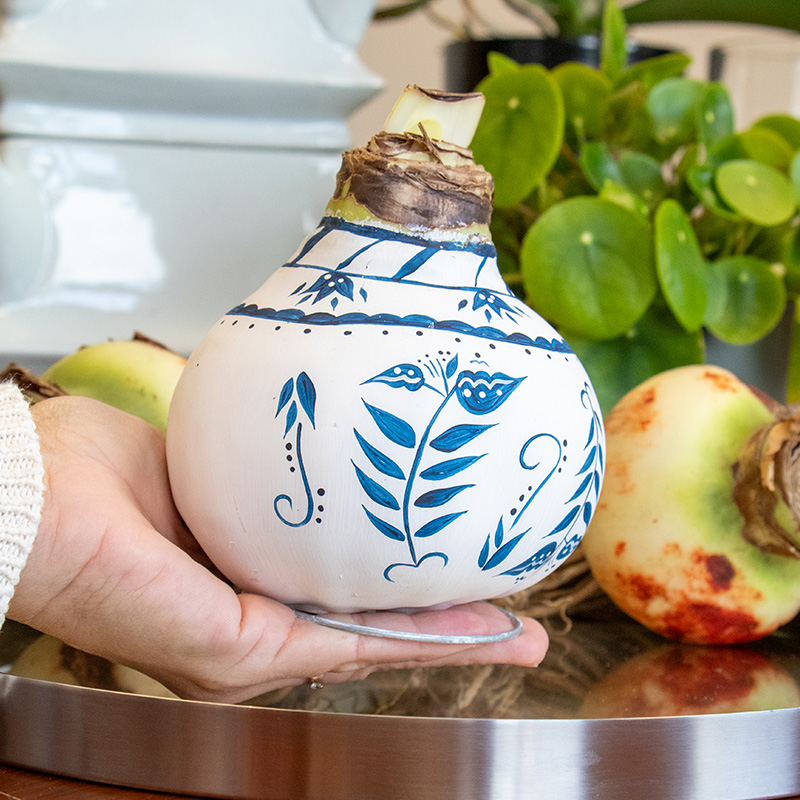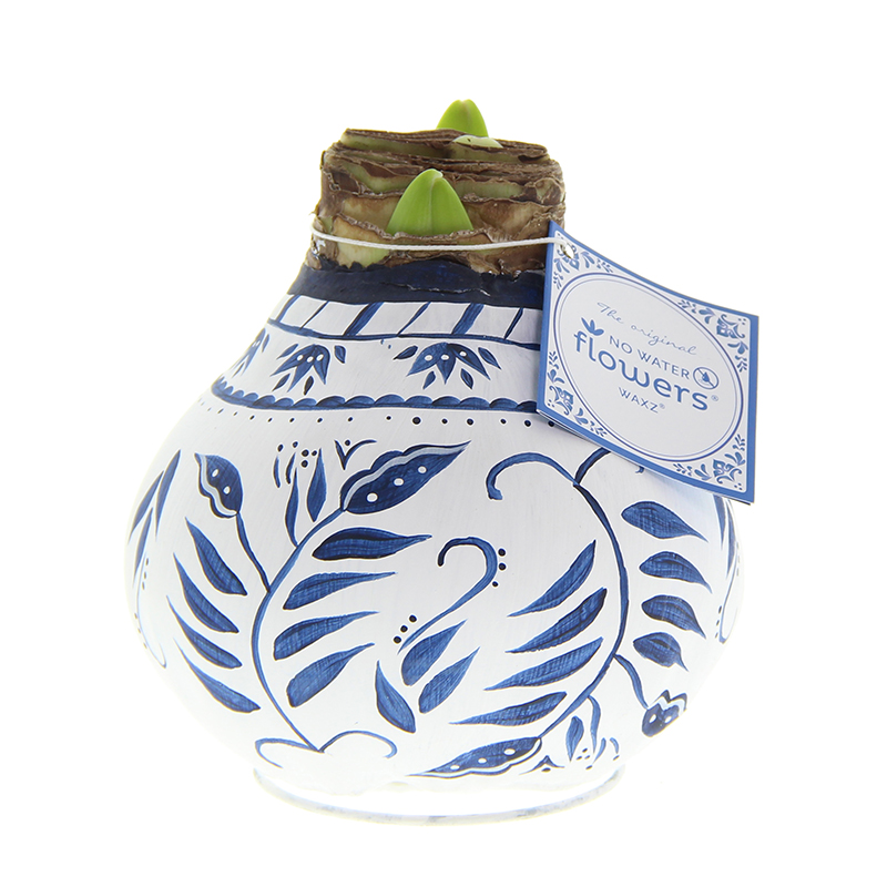 De extra grote wax amaryllis uit de "Delfts Blauw" serie is iets heel speciaals dat elke kamer zal vullen met elegantie en charme. Elke XXL "Delfts Blauw Leaf Pattern" wax amaryllis is echt uniek, want elke amaryllis is met de hand beschilderd en genummerd! Met een uitzonderlijk grote bolmaat van 36/38 is deze wax amaryllis een imposante verschijning.